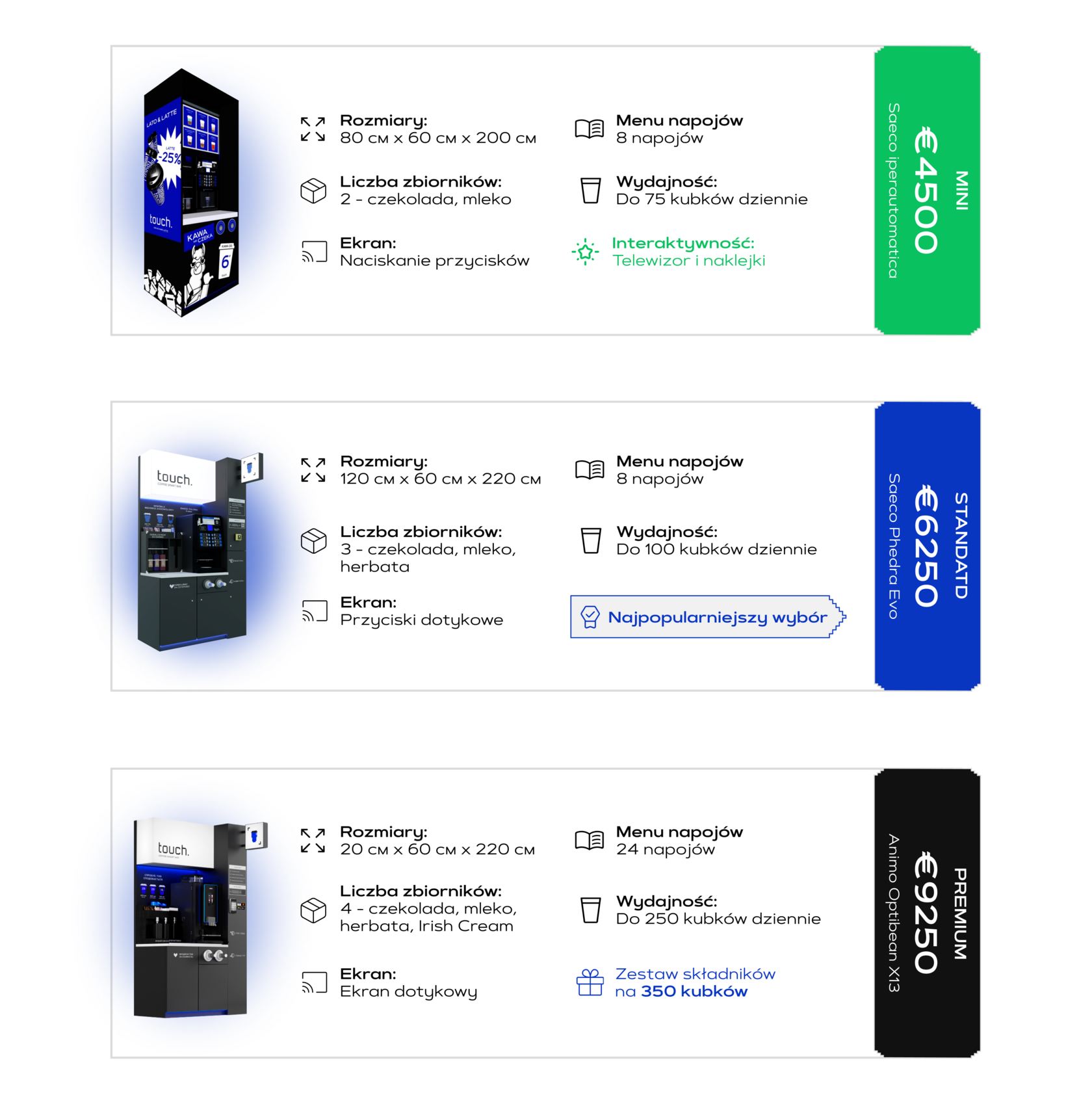 Chciałbym również podsumować główne informacje poniżej dla Państwa wygody.   |      |     |                           |     |   Ekspres do kawy Animo X13 - pakiet Premium / Ekspres do kawy Saeco Phaedra Evo - pakiet Standard / Ekspres do kawy Saeco iperautomatica - pakiet Mini   |       |             |     |   Solidna konstrukcja drewniana   |       |             |     |   Duża witryna świetlna - frontowa tablica reklamowa   |       |             |     |   Mała witryna świetlna - boczna tablica reklamowa (tylko w wersji Premium)   |       |               |     |   Organizer na syropy, serwetki, mieszadła, cukier, pokrywki, słomki, małe kubki do espresso   |       |             |     |   Kamera monitoringu online   |       |               |     |   Naklejki i podwójne oświetlenie z możliwością zmiany koloru   |       |             |     |   Pompa do przesyłania wody z butelki do ekspresu do kawy.   |       |             |     |   Interaktywność: telewizor i naklejki - pakiet Mini.   |       |             |     |   Starterowy zestaw składników (350 kubków - pakiet Premium, 100 kubków - pakiet Standard,  100 kubków dziennie - pakiet Mini)   |       |               |     |   Wsparcie księgowe i prawne   |       |             |     |   Pełne szkolenie z obsługi ekspresu do kawy   |       |         |     |              |   Na wszystkich prezentacjach możesz zobaczyć model kawiarni w formacie Premium - Animo X13. Wygląd wizualny kawiarni w standardowym formacie jest identyczny, z wyjątkiem maszyny do kawy.   |      |     |                 |   Przejdź pod poniższe linki:   |      |     |                 |   Pozdrawiam, Wiktor Tupko  Menedżer Touch TOUCH CSB Sp. z o.o.   |      |     |              |