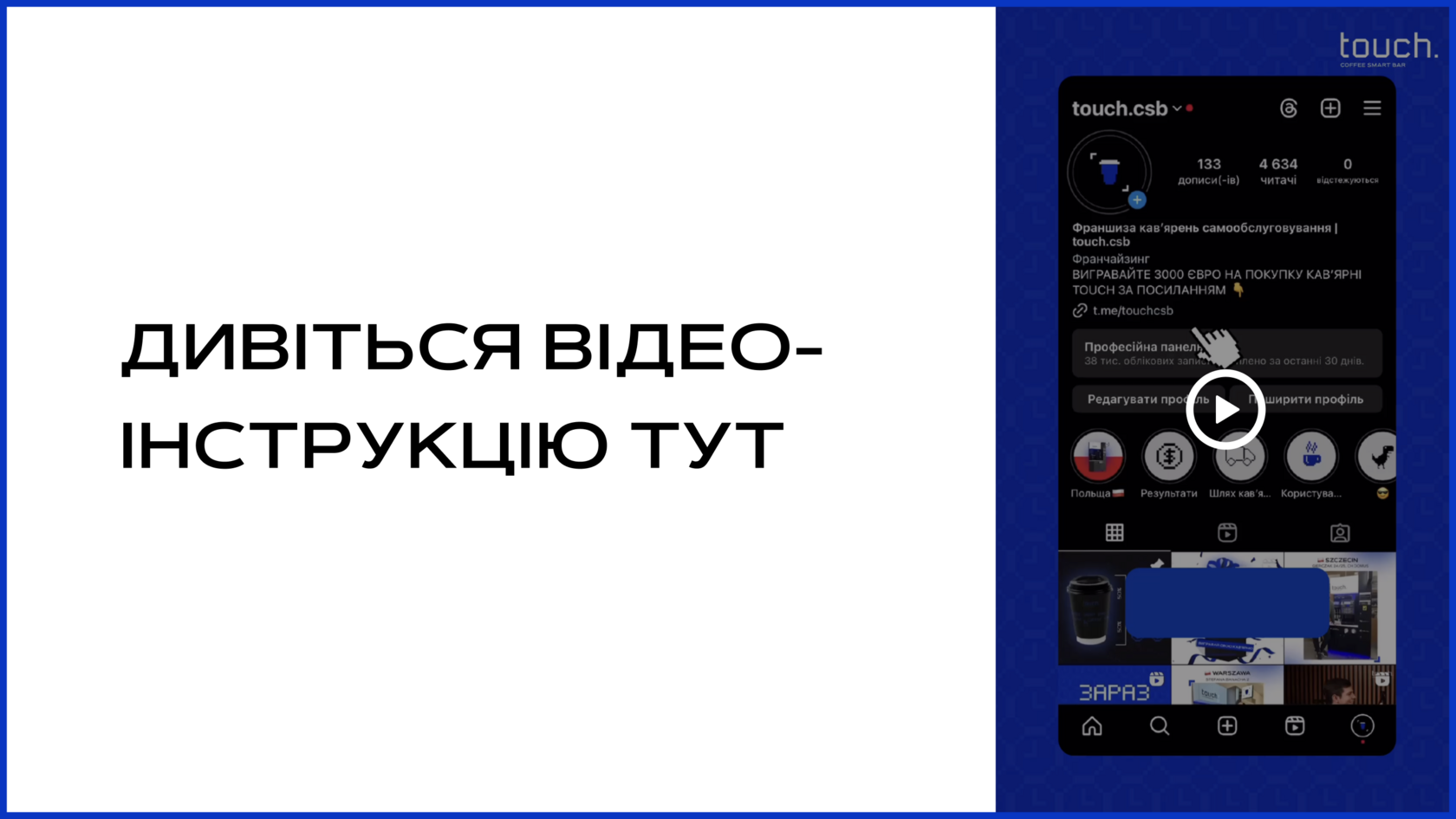 Дивіться відео-інструкцію, виконуйте усі умови та вигравайте 3000€ на відкриття власної кавʼярні TOUCH!