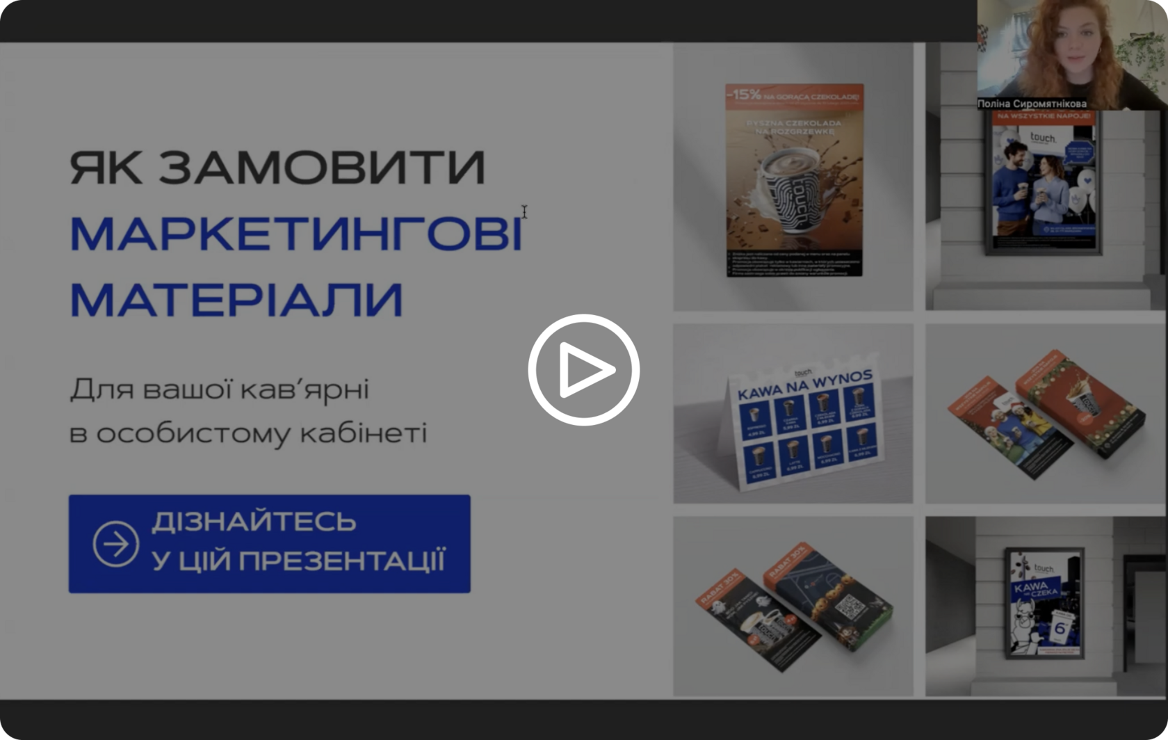 |      |     |                 |   2. Дізнайтесь, як правильно замовляти матеріали в друкарні та комунікувати з нею. Перегляньте відео 🔽   |      |     |                 |   Щоб знайти потрібні матеріали користуйтесь фільтром.   |      |     |                    |   Результат полягає у системних діях, а не разовій акції.   |      |     |              |   Слідкуйте за каналом для франчайзі в Telegram, щоб не пропустити найважливіші оновлення, можливості та спеціальні пропозиції.   |      |     |                 |