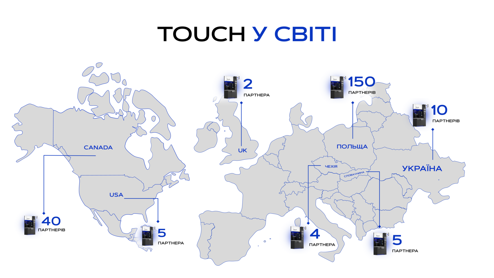 |      |     |                       |   Touch за останні 3 роки представлена у 8 країнах, включаючи Канаду, Польщу, Україну та інші.   |      |     |                 |   Переглянути більшість локацій в Польщі можна по посиланню нижче   |      |     |                  Слідкуйте за нашою  Інстаграм сторінкою. Там ви зможете дізнатись все про франшизу смарт-кав'ярень Touch    |      |     |                 |   Переходьте за посиланнями:   |      |     |                 |   З повагою, Dmytro Zarva TOUCH CSB Sp. z o.o ul. Marszałka Józefa Piłsudskiego 74/320, Wroclaw, Poland   |      |     |                 |   Почни власну справу разом з TOUCH!   |      |     |           |